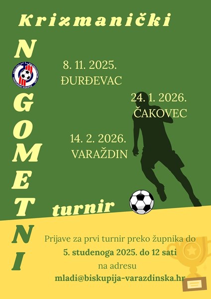Prvi turnir, koji će se održati, je Krizmanički malonogometni turnir, u subotu, 8. studenog 2025. godine u sportskim dvoranama SSŠ i OŠ Đurđevac. U 8:15h započet ćemo molitvom u župnoj crkvi sv. Jurja u Đurđevcu. Prijave su do srijede, 5. studenog 2025. do 12 sati.